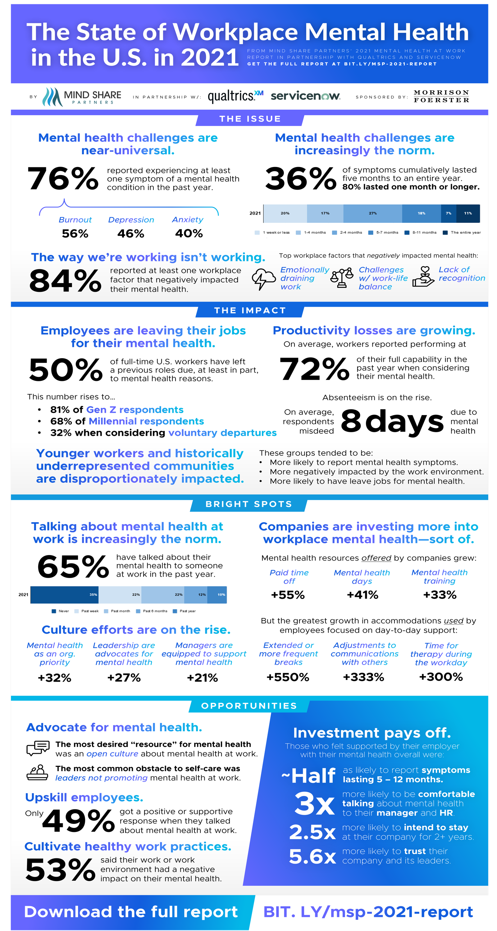 Investing in DEI to support employee mental health and address its intersectionality is also crucial. Black and AAPI employees have been hit especially hard by the trauma of systemic racism and violence. Workers who are caregivers — often mothers — have faced school closures and the associated burnout. Our study found that allowing employees to discuss challenging social and political topics at work is also part of a mentally healthy culture. At the grassroots level, employees should be empowered to form mental health employee resource groups (ERGs)and other affinity groups, become mental health champions, and start peer listening initiatives.